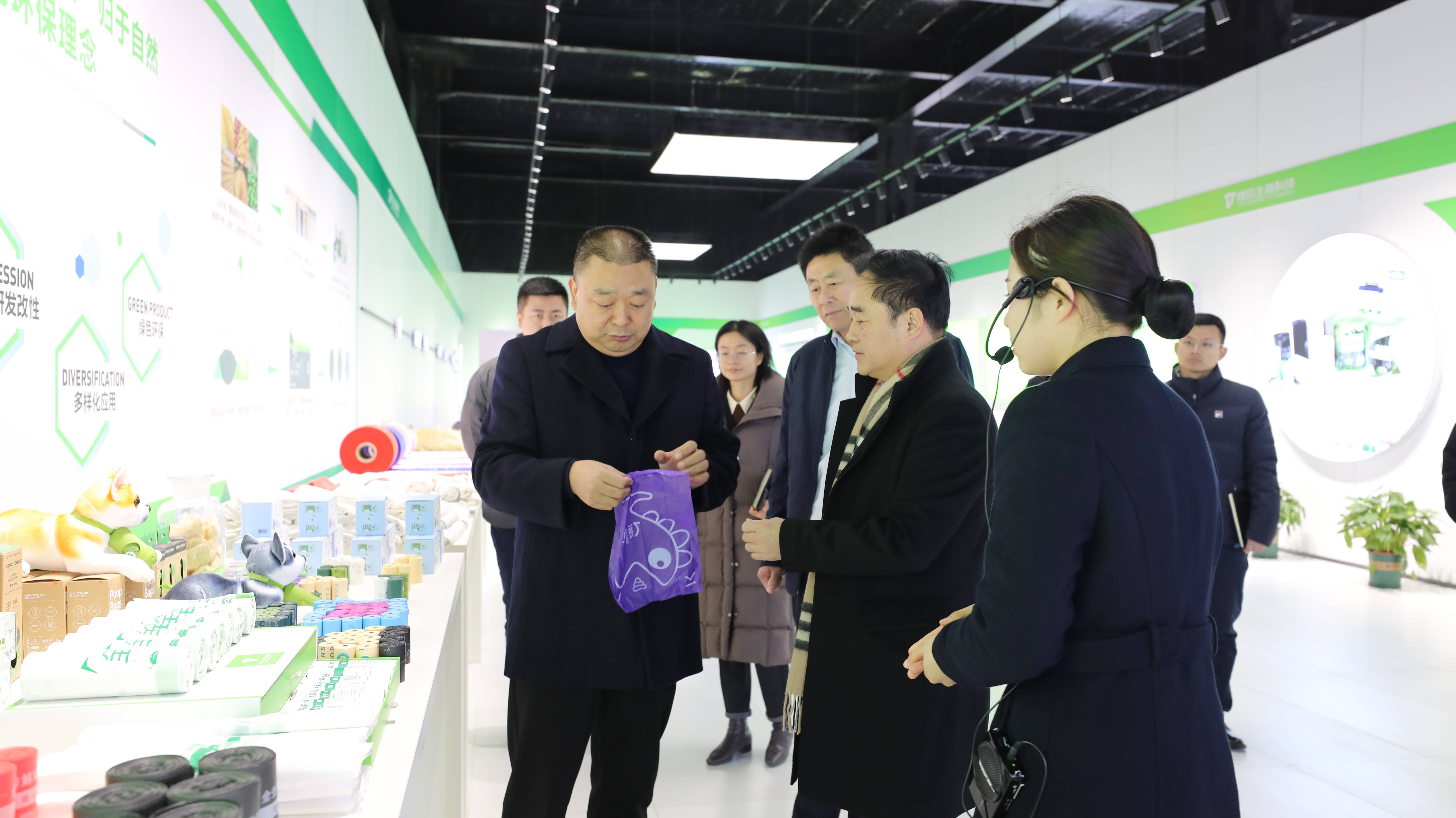 在河南特創生物科技可降解產業園,徐永新一行參觀了可降解產品展廳和研發中心,從原材料改性造粒、吹膜、印刷,再到公司生產的膜袋類、一次性餐具類、農業類、紡織服裝類、醫療衛生類等五大領域,八大系列產品,展示了全生物降解塑料的廣泛應用領域,以及特創生物豐富的產品系列。在生物降解材料生產車間,徐永新一行參觀了現代化生產線,詳細了解了生物降解材料的生產工藝和流程,還現場體驗了全生物降解快遞袋的拉伸強度等性能。