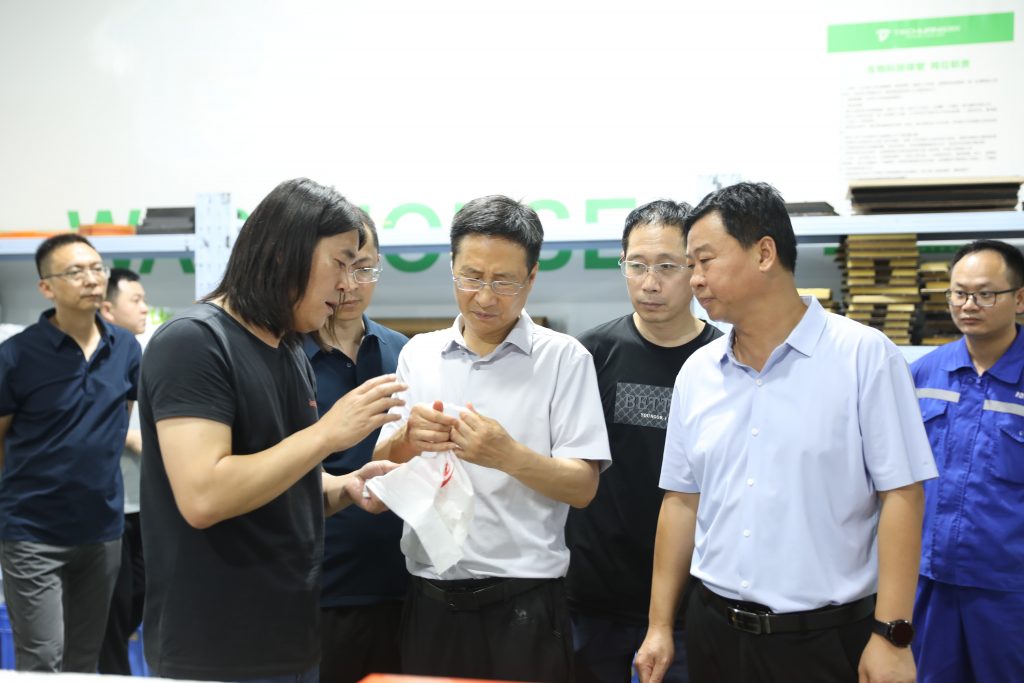 隨后,郜善軍一行又來到了河南特創(chuàng)現(xiàn)代化生產(chǎn)車間,近距離參觀了可降解制品的生產(chǎn)流程,并對公司高效的生產(chǎn)流程與嚴(yán)格的管理體系表示贊賞。郜善軍表示,在全省禁塑政策推動下,河南特創(chuàng)應(yīng)把握機遇,提升產(chǎn)能,優(yōu)化產(chǎn)品,為禁塑工作提供有力支持。